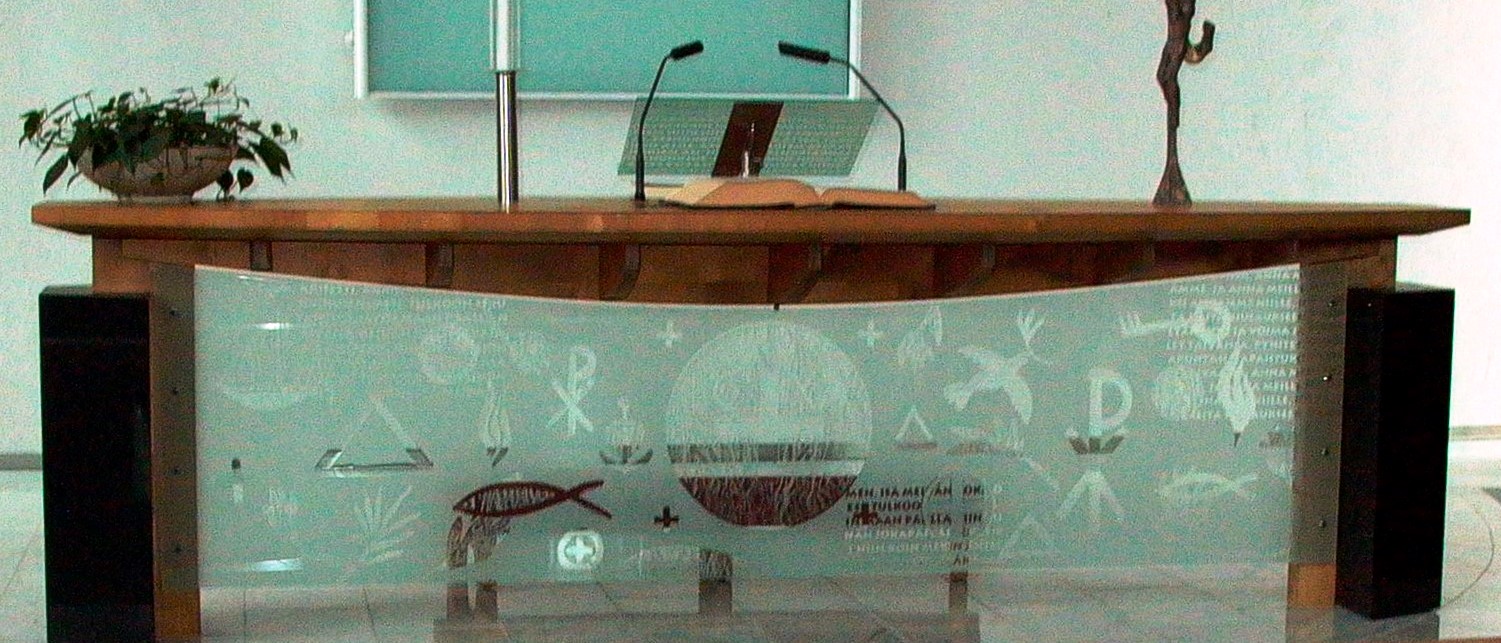 Läpikuultava lasilevy alttarin edessä kuvaa, kuinka näemme uskon silmin heijastuksia taivaasta jo täällä ajassa. Lasilevyn päällä oleva vene symboloi pelastusta kasteen kautta. Pietari kirjoittaa (1. Piet. 3:20-21), että kaste kantaa meitä samoin kuin arkki kantoi Nooaa sukulaisineen. Pylväät kuvaavat Salomon temppelin sisäänkäynnin pylväitä (1. Kun. 7:21). Pylväiden nimet Jakin ja Boas merkitsevät "Hän vahvistaa" ja "Hänessä on voima". Herra on vahvistava ja lohduttava niitä, jotka tulevat rukouksessa hänen tykönsä.